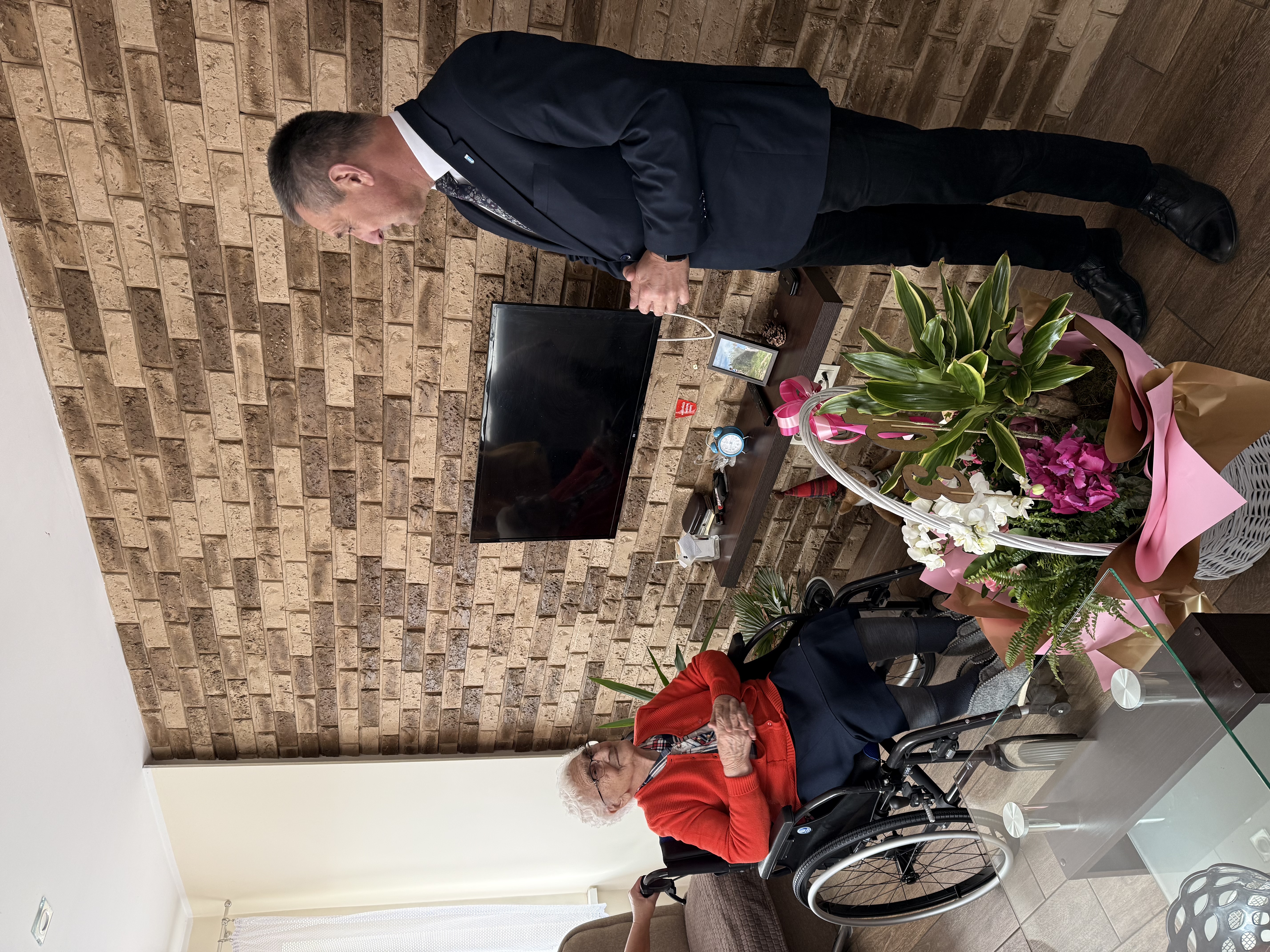 Podczas wizyty jubilatce wręczono list gratulacyjny oraz kosz kwiatów, dołączając najserdeczniejsze życzenia zdrowia, spokoju i wielu radosnych chwil. Spotkanie przebiegło w niezwykle ciepłej i serdecznej atmosferze, podkreślając, jak ważna jest pamięć o najstarszych mieszkańcach naszej gminy.