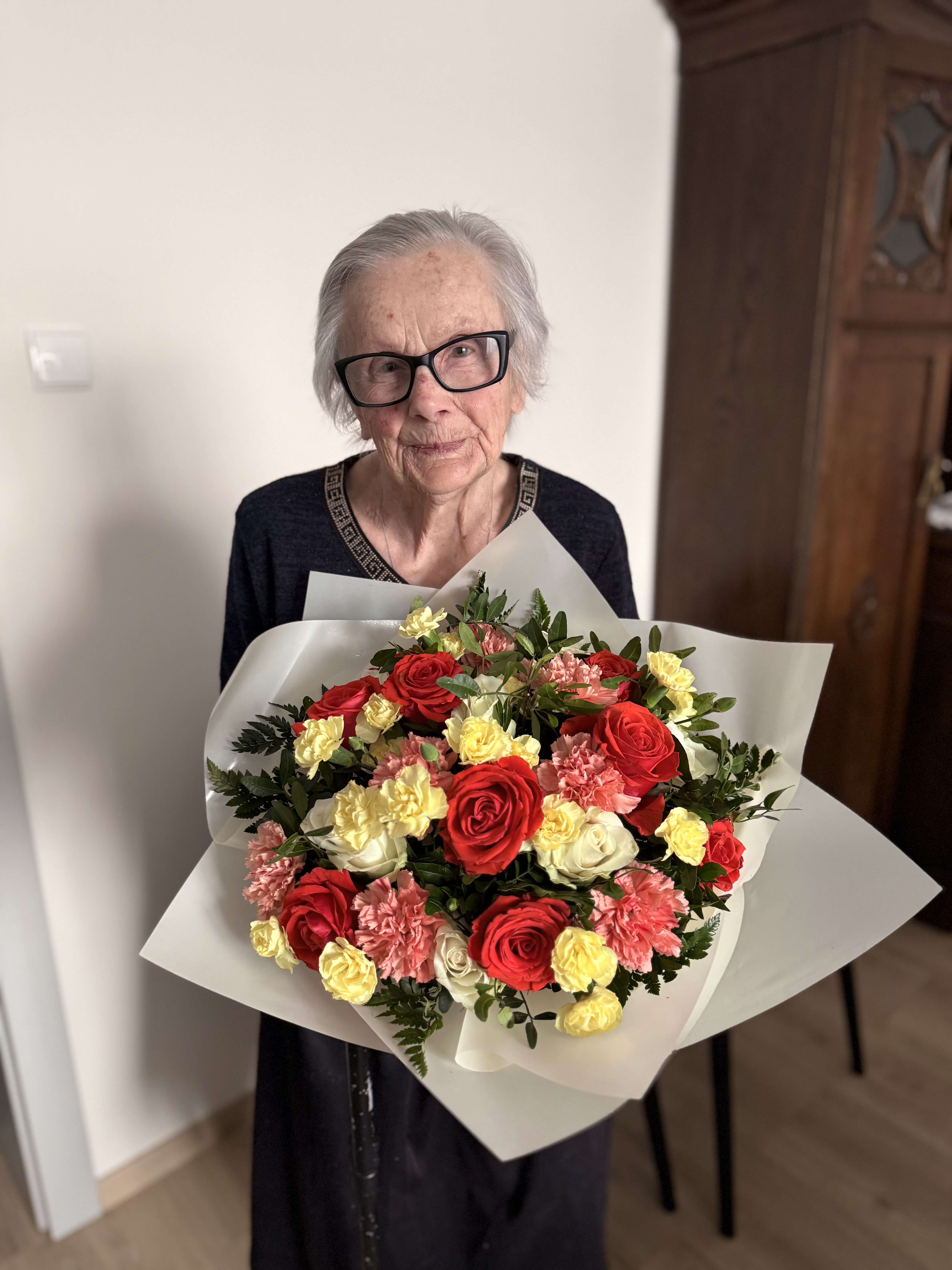 Następnie kierownik udał się do Perkowa, gdzie odwiedził panią Irenę Jędrzychowską, która w tym roku obchodzi 94. urodziny. Jubilatka również może poszczycić się liczną rodziną – troje dzieci, sześcioro wnuków oraz czworo prawnuków to jej największy skarb. Przez wiele lat prowadziła gospodarstwo rolne, co wiązało się z dużym zaangażowaniem i codzienną pracą. W wolnych chwilach znajdowała jednak czas na swoje zainteresowania – szczególnie lubiła czytać książki oraz zajmować się ogrodem. Obecnie z zainteresowaniem śledzi wydarzenia, oglądając programy telewizyjne i pozostając na bieżąco z tym, co dzieje się w kraju i na świecie.